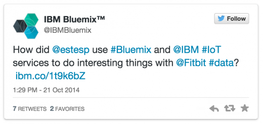 A few months ago I blogged about my developerWorks article on using IBM’s Bluemix with the wearable API service to do interesting things with Fitbit data and location services.
